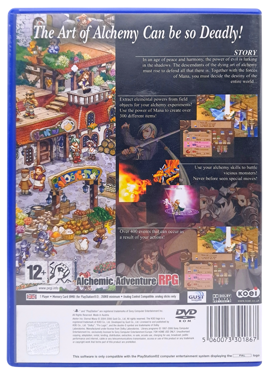 Atelier Iris: Eternal Mana til PlayStation 2 er et sjarmerende japansk rollespill som kombinerer klassisk fantasy, dyp alkymi-mekanikk og turbaserte kamper i en varm og eventyrlig spillverden. Spillet er kjent for sin fargerike stil, stemningsfulle musikk og rolige, utforskende tempo som skiller seg fra mørkere JRPG-titler fra samme periode. For fans av retrospill og klassiske PS2-opplevelser er dette en tidløs reise fylt med magi og oppdagelser.