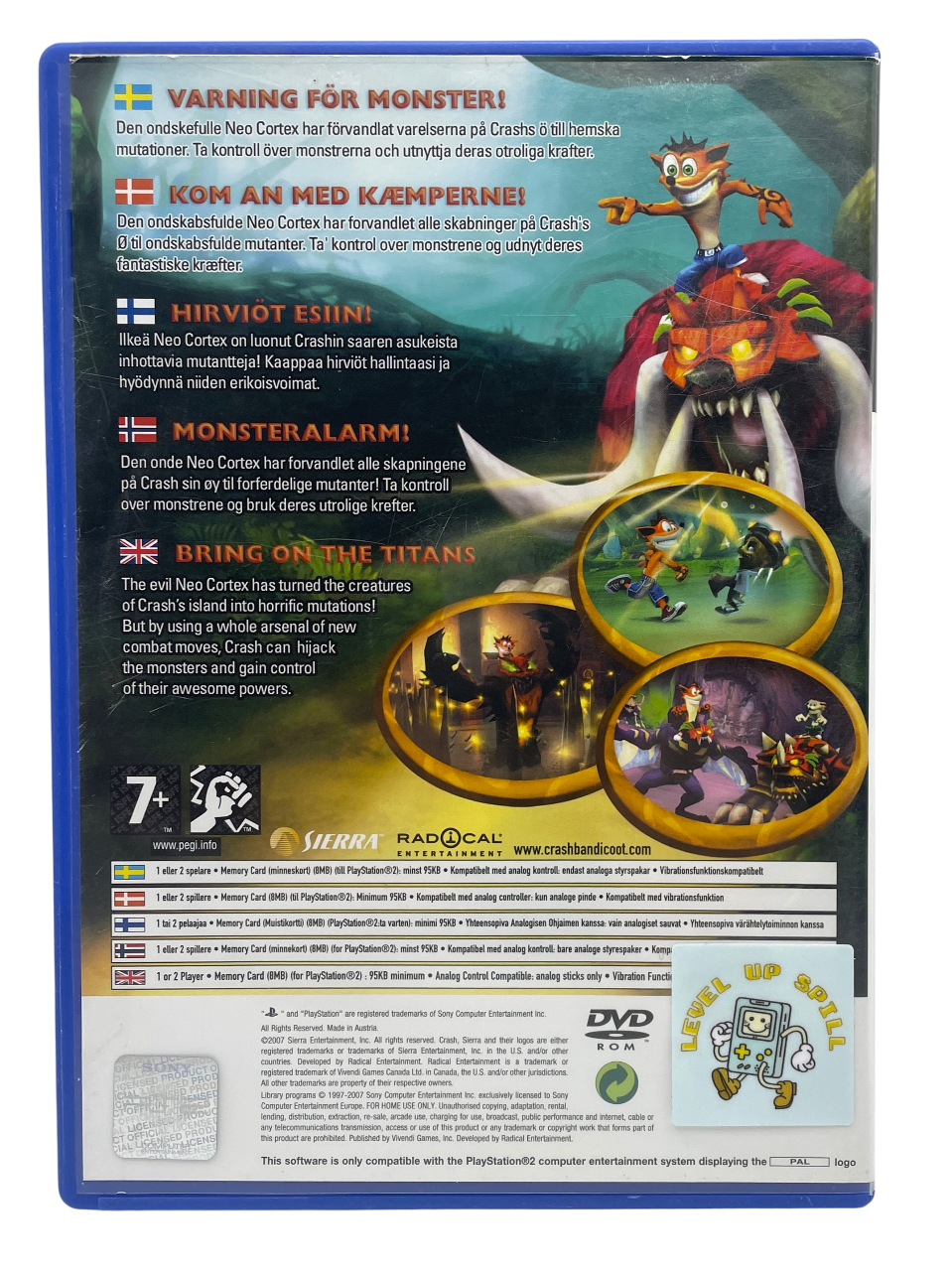 Bli med Crash Bandicoot på et nytt og actionfylt eventyr i Crash of the Titans til PlayStation 2. Denne nytolkningen av den klassiske serien gir Crash nye krefter, nye fiender og et friskt gameplay som kombinerer plattform, slåssing og humor. Spillet markerer en moderne vri på Crash-formelen, der vår oransje helt må redde øya fra den onde Dr. Neo Cortex og hans nymotens mutantkreaturer.