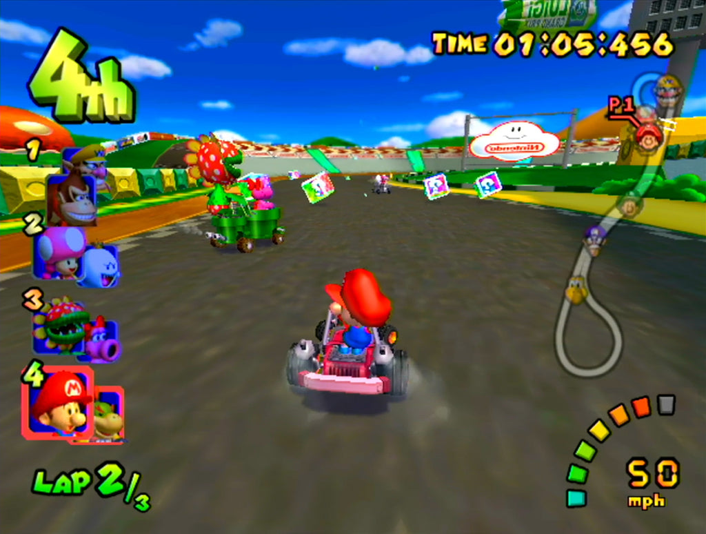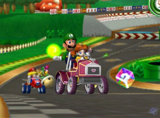 Double Dash!! introduserer noen av de mest minneverdige banene i serien: Dino Dino Jungle, Wario Colosseum, DK Mountain og Baby Park, for å nevne noen. Spillet støtter opptil 4 spillere lokalt – eller hele 8 med to GameCuber koblet sammen – og tilbyr flerspiller i verdensklasse, både konkurransepreget og kaotisk moro.