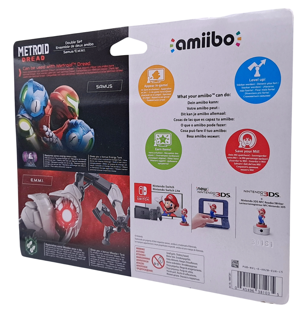 Dette er Metroid Dread amiibo – Samus & E.M.M.I. Double Pack, levert i original eske. Denne amiibo-pakken ble lansert i forbindelse med Metroid Dread og er en svært ettertraktet utgivelse blant både Nintendo-fans, Metroid-samlere og amiibo-entusiaster. Figurenes detaljerte design og direkte spillfunksjonalitet gjør dette til en av de mest populære amiibo-utgivelsene fra Switch-æraen.