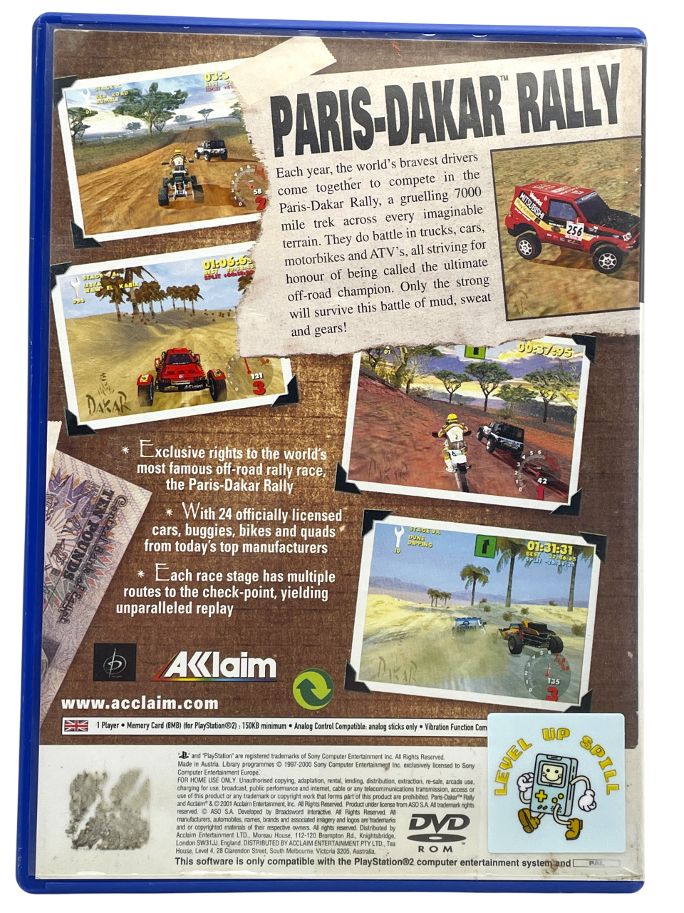 Spillet tar deg med gjennom ørkener, fjellpass, gjørmete løpstrekk og uforutsigbare sandstormer som setter både kjøretøyet og ferdighetene dine på prøve. Paris-Dakar Rally byr på en rekke etapper inspirert av det faktiske løpet, og gir en spillopplevelse der både motorstyring og taktiskel valg betyr alt. For fans av klassiske spill og brukte spill med fokus på realistisk racing, står dette som en interessant og ofte undervurdert tittel fra PS2-æraen.