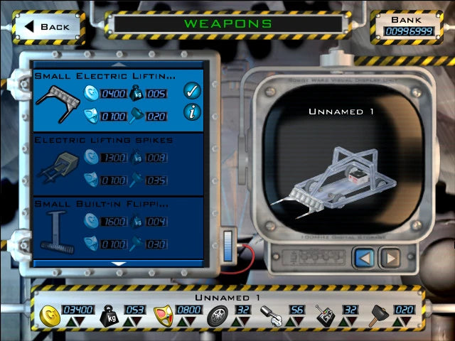 I Robot Wars: Arenas of Destruction starter du med et begrenset budsjett og et enkelt chassis. Etter hvert som du vinner kamper, kan du oppgradere roboten med kraftigere motorer, bedre rustning og dødelige våpen som sager, hammere, flammekastere og spikes. Dette gir spillet en taktisk dimensjon – hver oppgradering påvirker hastighet, styrke og balanse.