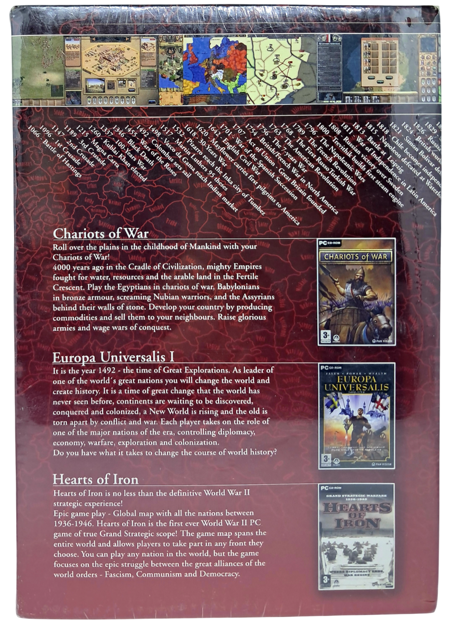 Samlingen gir deg muligheten til å styre og lede nasjoner gjennom noen av historiens mest dramatiske perioder, fra det antikke imperiet i Chariots of War til de globale maktkampene i Hearts of Iron og Europa Universalis I. Hver tittel tilbyr unike strategiske utfordringer, fra militær ledelse til diplomatiske forhandlinger, og gir spillerne en helhetlig opplevelse av maktkamp på tvers av tidsepoker.