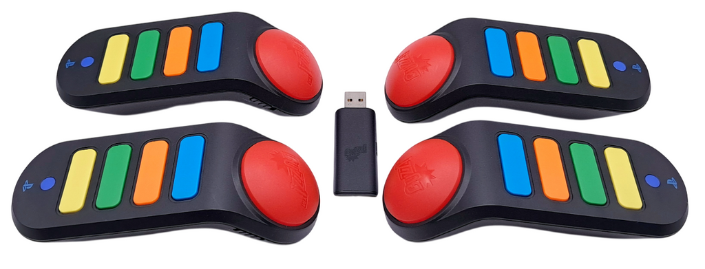 Komplett sett: Inkluderer 4 buzzere og USB-mottaker – alt du trenger for å starte festen.